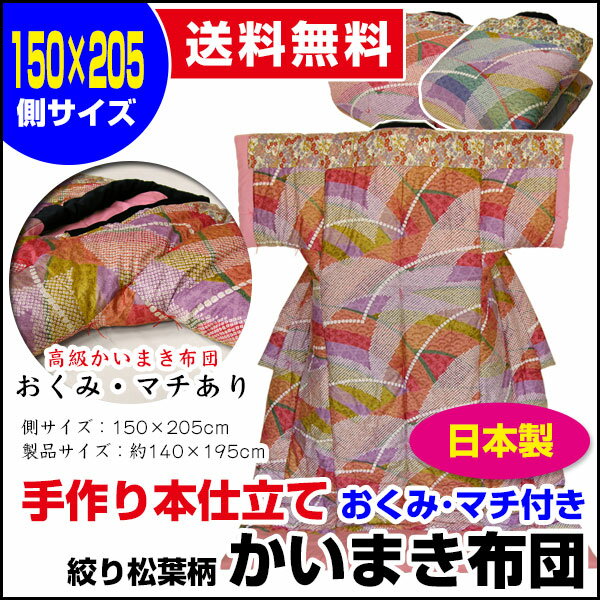 品質表示 【絞り松葉柄】 表地:綿サテン(綿100%) 裏地:綿ブロード(綿100%) 打ち込み本数150本 中わた量:混綿わた2.4kg 中わた品質:綿60%、ポリエステル40% 製品重量:約3.3kg カラー エンジ、紺 原産国 日本 サイズ 【絞り松葉柄】製品サイズ:約140×195cm(側サイズ:150×205cm) 【かいまきカバー】本仕立てかいまき布団専用カバー側サイズ:150×205cm ※「本仕立てかいまき布団専用カバー」は、他のかいまき布団にはご使用になれません。