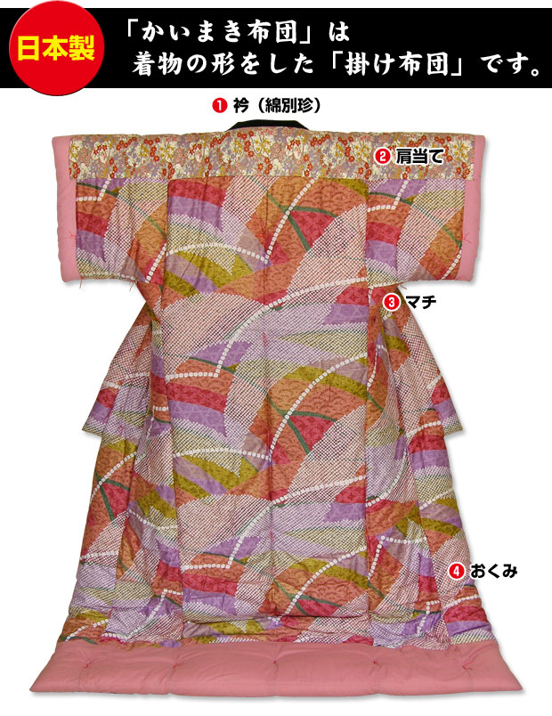 手作り本仕立て かいまき布団 おくみ・マチ付き【絞り松葉柄】 商品説明 「おくみ」とは着物の左右の前身頃に縫いつける、襟から裾までの細長い半幅の布のことです。